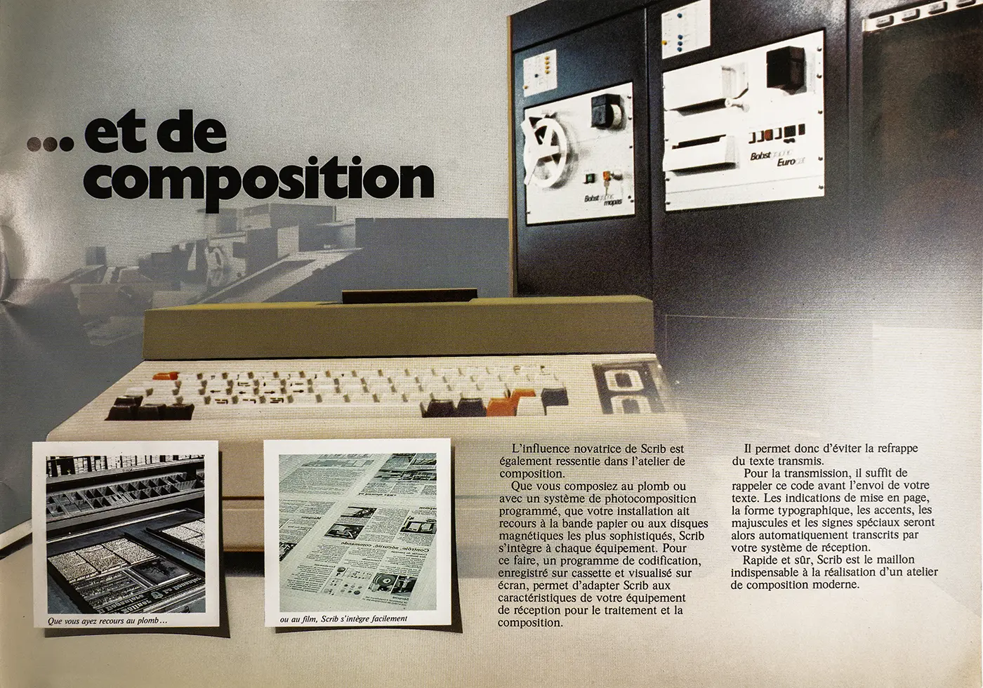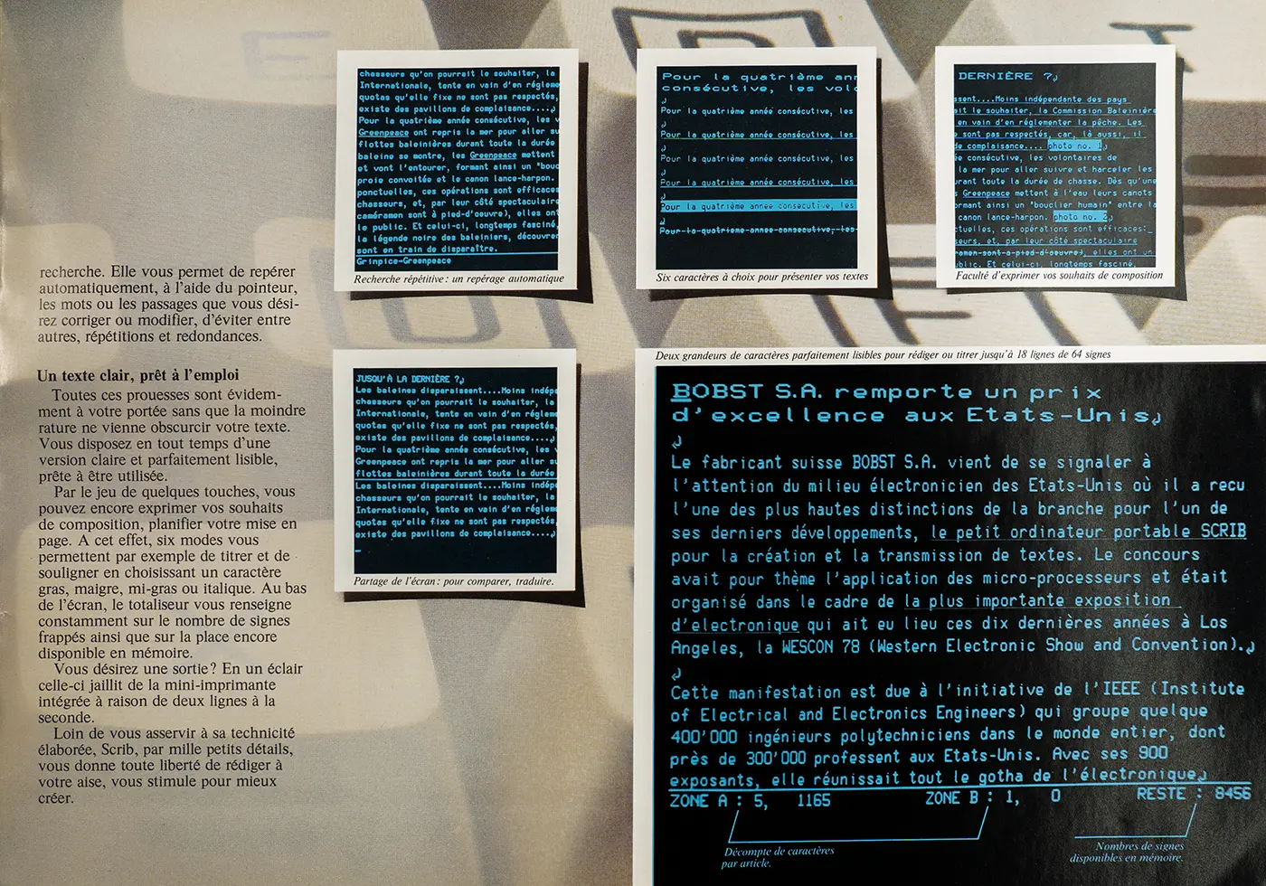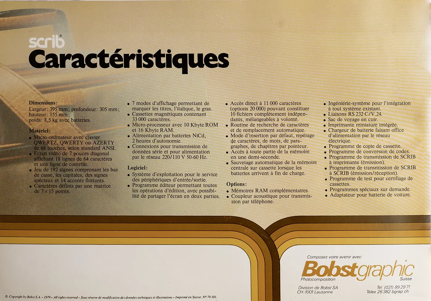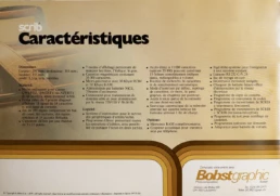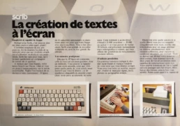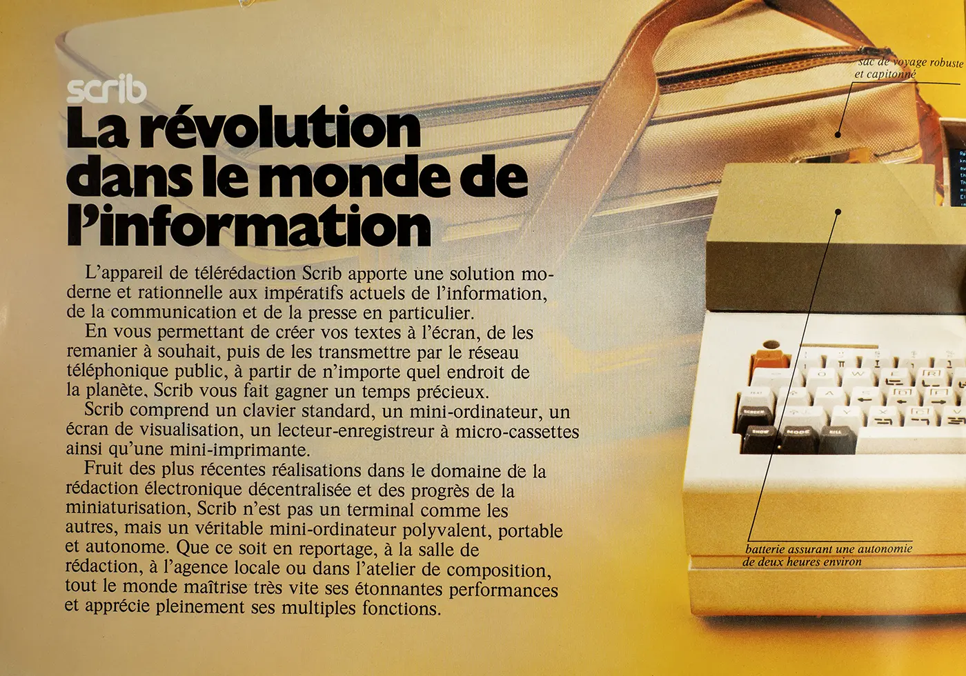 Fruit des plus récentes réalisations dans le domaine de la rédaction électronique décentralisée et des progrès de la miniaturisation, Scrib n’est pas un terminal comme les autres, mais un véritable mini-ordinateur polyvalent, portable et autonome. Que ce soit en reportage, à la salle de rédaction, à l’agence locale ou dans l’atelier de composition, tout le monde maîtrise très vite ses étonnantes performances et apprécie pleinement ses multiples fonctions.