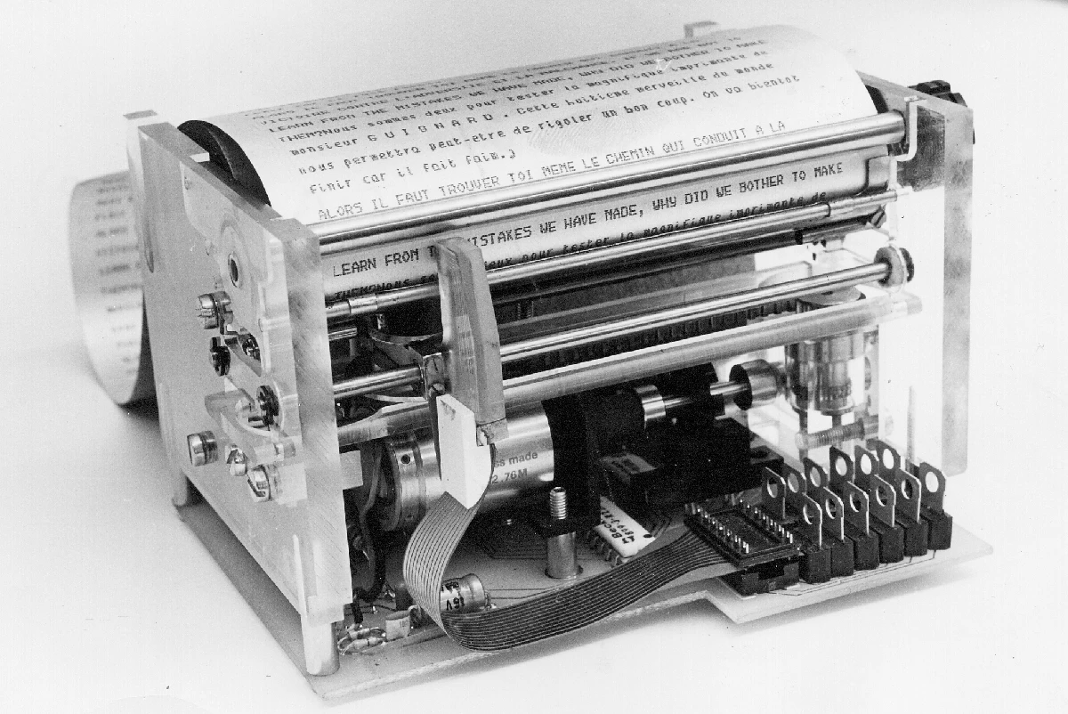 L’imprimante du Scrib: la collaboration entre des spécialistes de la mécanique, de l’électronique et de la programmation a permis un système simple, de faible consommation de puissance et performant (impression dans les deux sens).