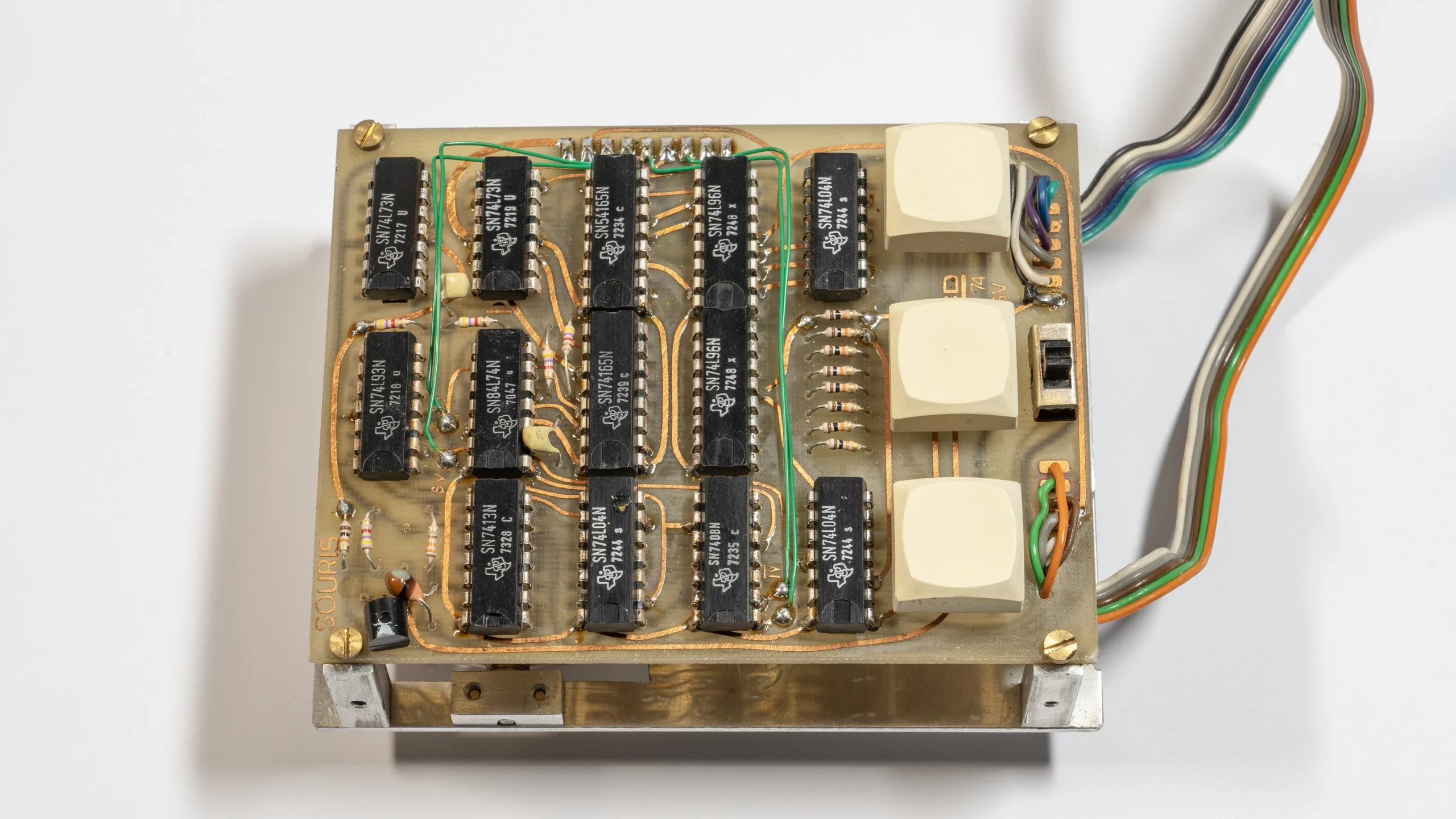 rencontré à Stanford en 1973, conservait les deux roues mais remplaçait les potentiomètres par un encodeur optique. L’interface sérialise en format ICOUP pour le miniordinateur Nova l’état de l’encodeur et l’état des poussoirs en supprimant les rebonds de contact.